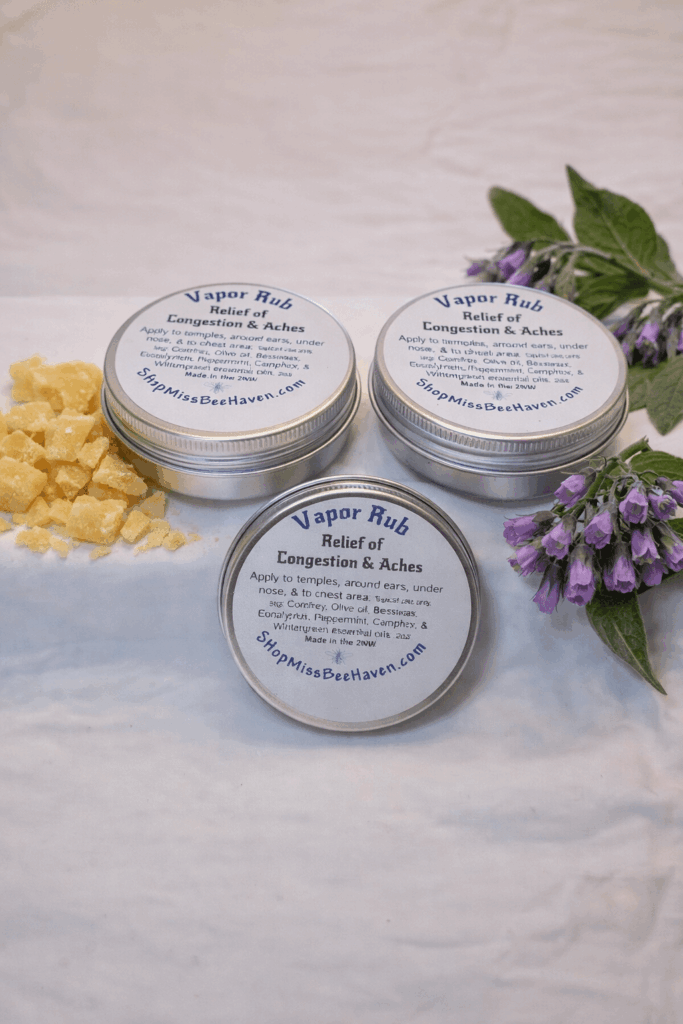 Our Herbal Vapor Rub is a soothing, beeswax-based balm crafted to help ease congestion, muscle aches, and everyday discomfort. Made with comfrey-infused oil, beeswax, and a carefully blended mix of essential oils, this rub provides comforting relief with a fresh, invigorating aroma.