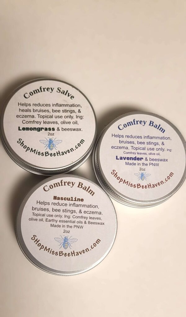 Our Comfrey Salve is a soothing, beeswax-based herbal salve crafted to support tired muscles, bruises, and dry or irritated skin. Made with comfrey-infused olive oil, natural beeswax, and uplifting lemongrass, this salve melts smoothly into the skin to provide comforting, targeted care.