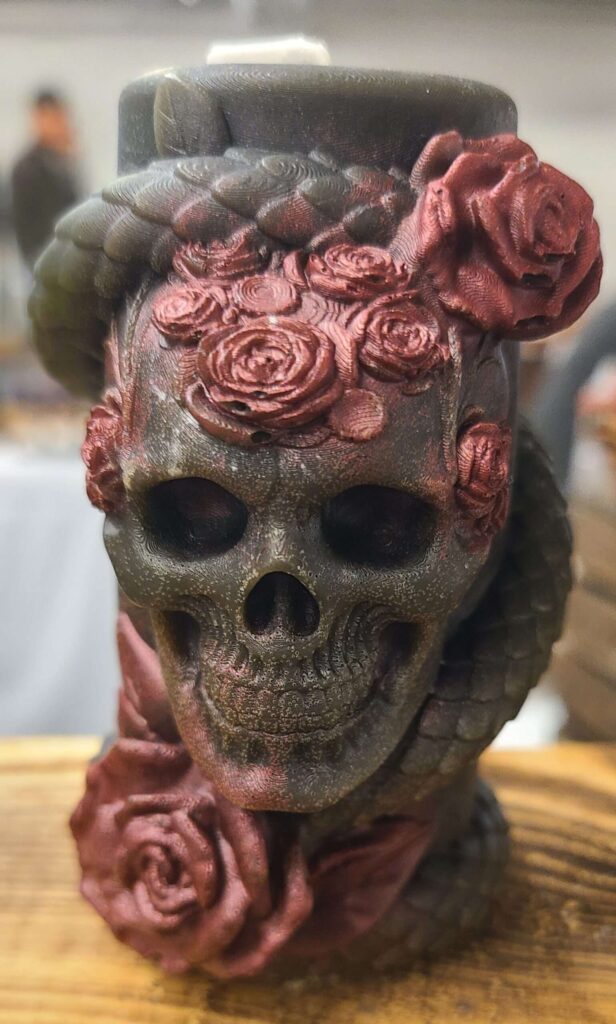 A skull and snake candle symbolizes the profound duality of life and death, combined with themes of rebirth, transformation, and healing. The skull represents mortality, ancestors, and the other side of the veil, while the snake signifies shedding old skin, new beginnings, and overcoming past burdens to achieve metamorphosis and personal growth.